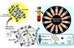 该研究开发了一种基于碳量子点(CQDs)嵌入柠檬酸跨联果胶基质的荧光平台,用于人血清葡萄糖监测。 其原理基于竞争性酯化驱动的荧光调制:葡萄糖扰乱了交联网络,导致明显的荧光淬灭。该传感器在生理条件下具有极佳的稳定性,检测结果与临床设备高度一致,为糖尿病管理提供了高灵敏度的分析工具。