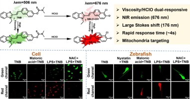 开发了一种能靶向线粒体的双响应探针TNB。 在高粘度下发射绿光,而遇到次氯酸(HClO)则发射近红外光。该探针成功实现了在活体斑马鱼和细胞氧化应激过程中粘度与次氯酸波动的双通道成像,展示了优异的光稳定性和灵敏度。