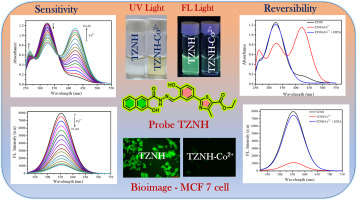 合成了一种名为TZNH的化学传感器,专门用于检测钴离子(Co2+)。 钴离子的加入导致溶液发生明显的从无色到黄色的视觉转变,同时荧光显著减弱。该传感器已成功应用于真实水样的检测以及乳腺癌细胞的成像,表现出极低的检测限。