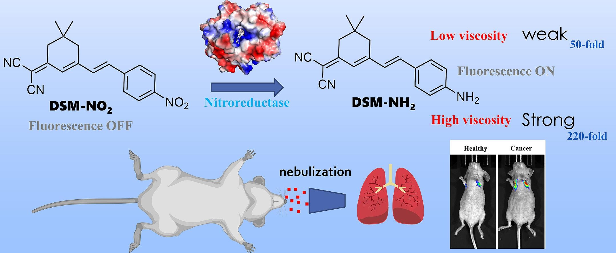 Qiu等人开发了一种近红外荧光探针DSM-NO2,用于检测肿瘤细胞内硝基还原酶(NTR)的活性。该探针通过一步合成法获得,对NTR高度敏感,能在缺氧条件下实现50倍的荧光增强,检测限低至1纳克/毫升。在肿瘤细胞缺氧环境中,由于细胞粘度增加,荧光增强效果可达220倍,检测限进一步降低至55皮克/毫升。