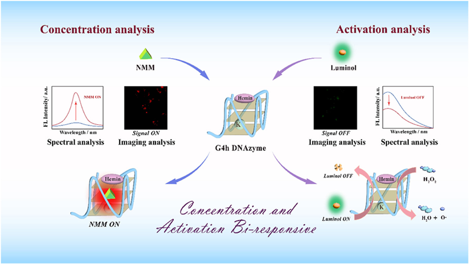 Liang等人报道了一种基于 G4h DNA 酶模型的新型浓度和活化双响应策略,该策略同时使用 G4h 结构特异性信号探针进行酶浓度分析和 G4h DNA 酶催化反应进行酶活化分析。在最佳条件下,双反应策略可有效地用于同时分析 G4h DNA 酶的浓度和活化情况,其检测限分别为 718.7 pM 和 233.4 nM