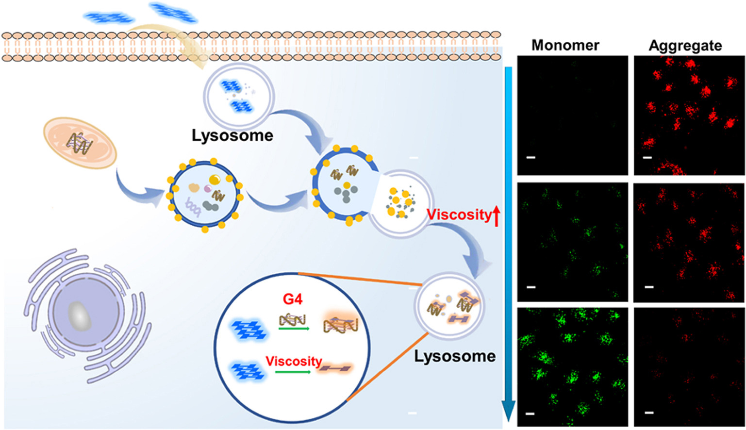Tang等人报道了一种基于花菁的超分子荧光探针, 探针不仅具备粘度响应的特性,还能选择性地对G-quadruplex进行成像,基于这种特性,作者将其用于细胞自噬的动态研究。