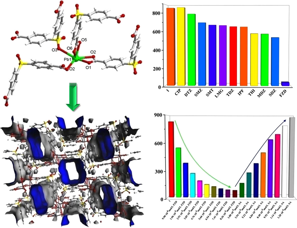 Jin等人成功合成并表征了一种新的基于Pb(II)的三维金属有机框架(MOF)材料[Pb(SDBA)]n·1.75DMF(1)。该MOF被用作发光传感器,用于敏感且选择性地检测抗生素,特别是能够选择性地识别呋喃唑酮(FZD),检测限低至1.01 × 10-6 M。有趣的是,使用浸有该MOF的试纸条,在365 nm紫外灯下可直接用肉眼检测FZD。