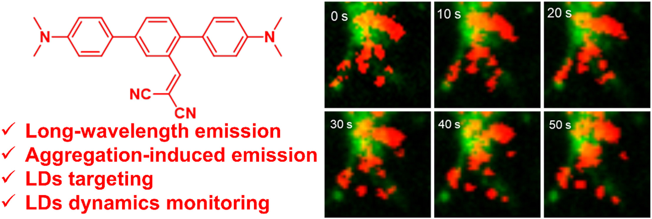 Wang等人报道了一种具备“免洗”特性的荧光探针,该探针基于苄基亚甲基丙二腈桥接的 "D-A-D "结构,具备聚集诱导发光的特性,因此材料在生物成像中具有 "免洗 "特性,此外,APBM 还具有出色的 LDs 靶向能力,可成功用于区分正常细胞和癌细胞,监测不同营养条件下 LDs 的动态以及与线粒体的相互作用。