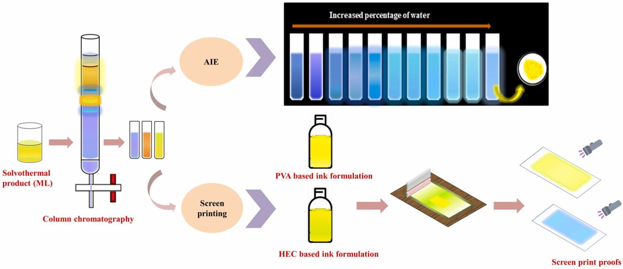 Anand等人利用芘甲醛衍生物制备了一种碳点,这种碳点在四氢呋喃和水的混合溶液中展现出了聚集诱导发光特性,而作者利用这种特性实现了酒精中水分的检测,此外,合成的碳点还可以被用作丝网油墨的荧光着色剂,使用这种着色剂的印刷品能够发射出黄色的荧光,因此能够实现防伪的功能。