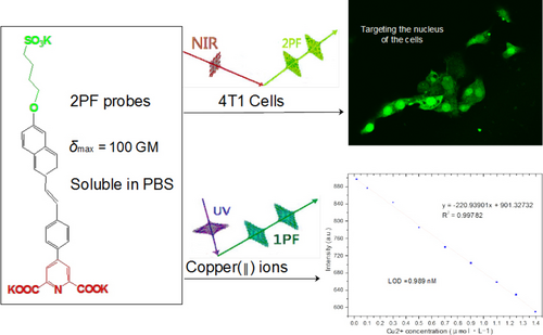 Yu等人最近研究了一种吡啶-2,6-二羧酸衍生物的荧光特性,结果发现这种材料中的羧基和吡啶组成的结构可以和多种金属阳离子结合,并以此淬灭探针的荧光,同时,探针具备较大的双光子吸收截面,约100GM,而生物成像发现该荧光探针可以靶向到细胞的细胞核,因此可以作为细胞核的铜离子检测探针。