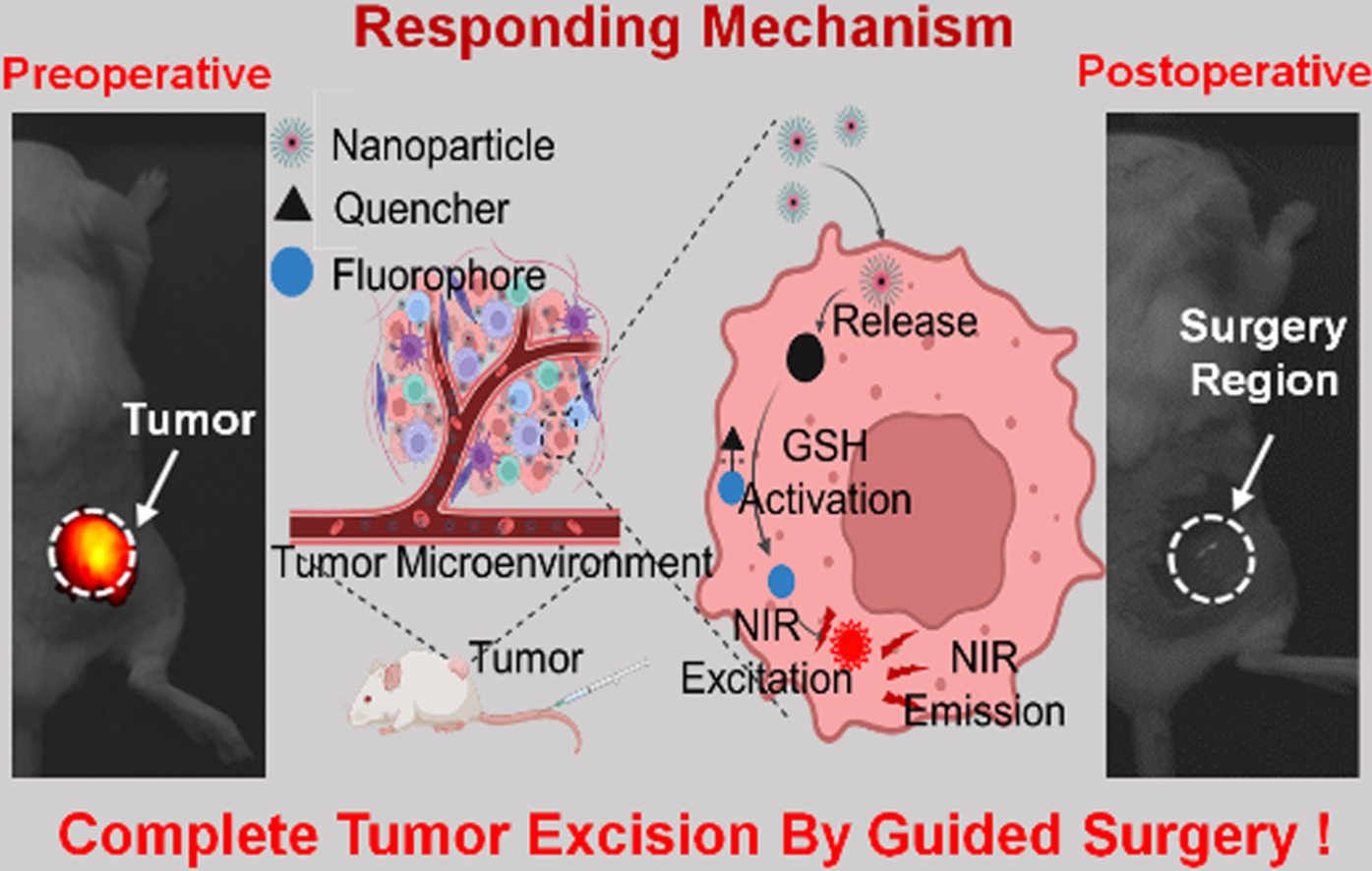 An等人成功合成了一种γ-谷胱甘肽(GSH)响应的近红外(NIR)BODIPY探针“Pro-Dye”,该探针在溶液和高浓度GSH的癌细胞内能被迅速特异性激活,而在正常细胞中保持惰性。在Pro-Dye纳米颗粒荧光成像的实时引导下,能够精确切除肿瘤,边界清晰。
