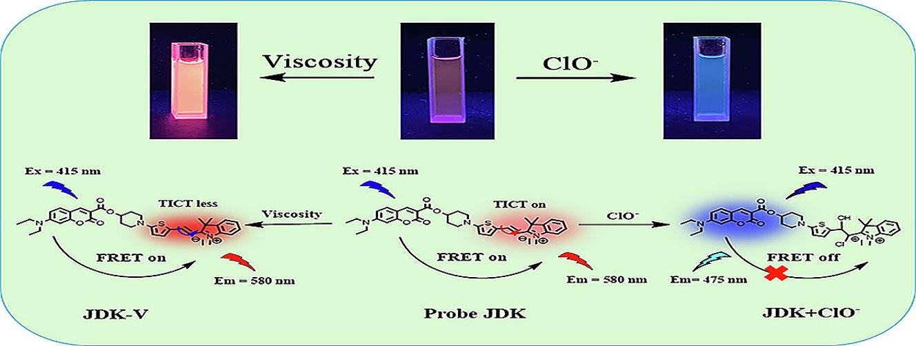 Yan等人开发了一种名为JDK的荧光探针,用于实时监测和原位检测次氯酸盐和粘度水平,这两者作为关键的微环境指标,在疾病诊断中具有重要意义。JDK探针基于FRET和TICT系统,采用了一种新型受体——2-(2-(5-(二甲基氨基)噻吩-2-基)乙烯基)-1,3,3-三甲基-3H-吲哚-1-鎓荧光团。JDK探针能够以极快的响应时间(1分钟内)和低检测限(28.5 nM)追踪次氯酸盐。重要的是,JDK探针易于附着于线粒体,而线粒体中的生理过程可能会因次氯酸盐和粘度异常浓度而受到干扰。研究成功地在活细胞和斑马鱼中可视化了内源性次氯酸盐和粘度水平。