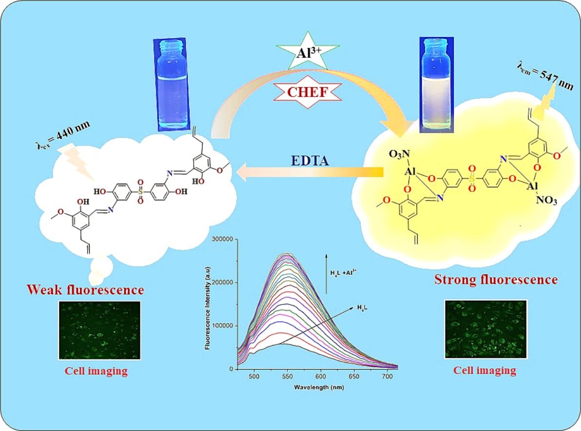 Saha等人开发了一种基于丁香酚磺酰基衍生物的荧光化学传感器H4L,该传感器在存在其他竞争金属离子的情况下,能够对Al3+实现高选择性的检测。此外,作者还研究了在Na2EDTA存在下H4L的再生性和可逆性。并且已有效用于实际样品及试纸条中Al3+离子的检测。