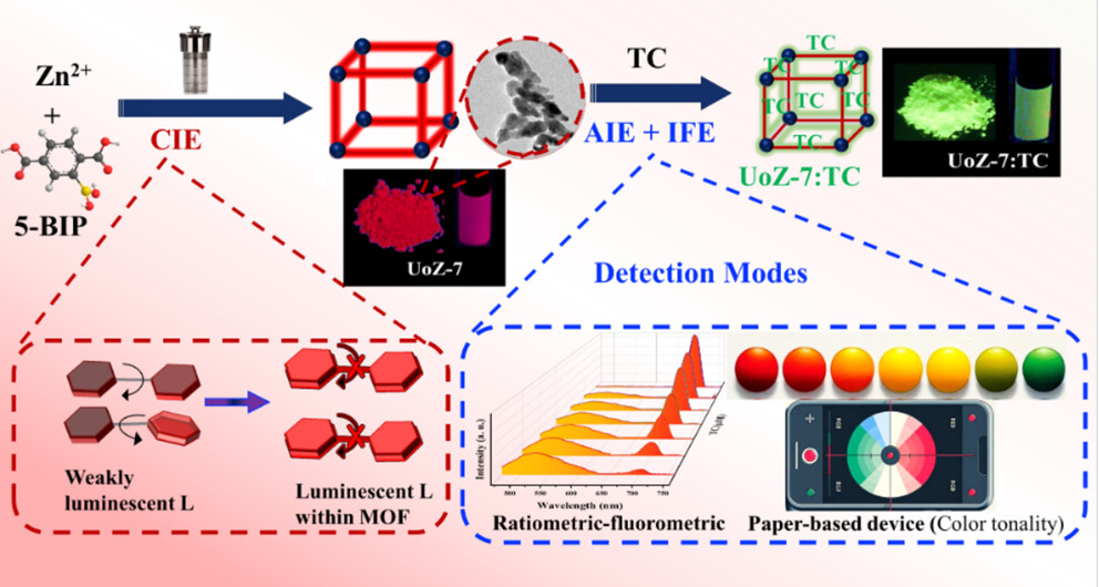 Omer成功合成了一种新型双态红色发光的锌基金属有机框架(MOF,命名为UoZ-7),能够在溶液和固态纸基上检测目标分子。UoZ-7被成功应用于四环素(TC)的双模式检测,包括荧光比率法和显色法。