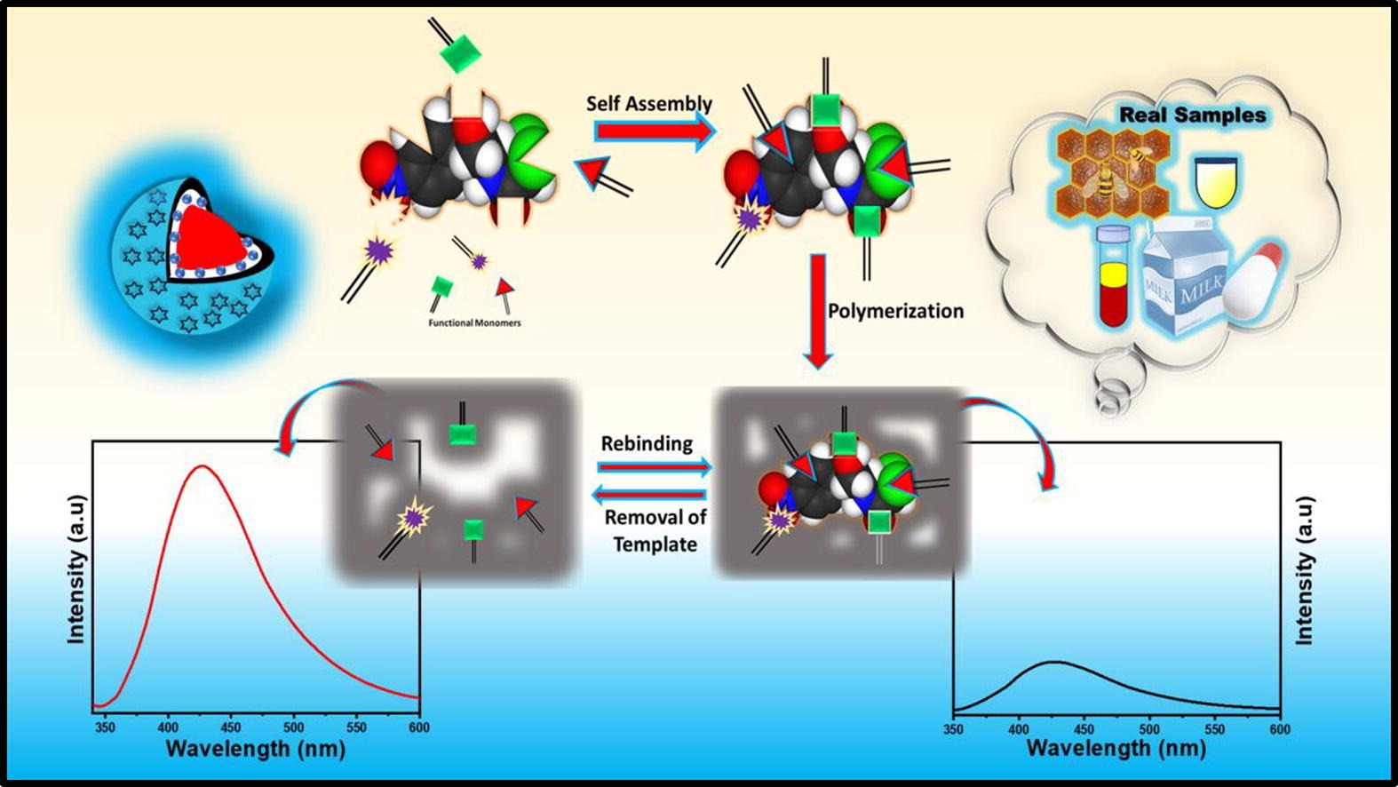 Nasimalai等人开发出一种基于氮硫掺杂碳量子点(N, S-CQDs)的分子印迹聚合物(MIP)传感器,用于检测食品和临床样本中纳摩尔级别的氯霉素(CPL)。该传感器检测限低至7.65 nM,线性范围为0.24 μM至26.1 μM。在实际应用中,传感器对临床和食品样本的检测表现出高度一致性。