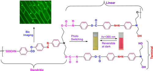 Nasar等人合成了一种新型 AB2型封端异氰酸酯单体,能够在DMF中形成超支化聚(偶氮酯)氨基甲酸酯(HBPAEUs)。这种聚合物不仅能对各种革兰氏阳性和革兰氏阴性细菌表现出抗菌活性,而且能够对洋葱表皮细胞和真菌细胞进行染色成像。