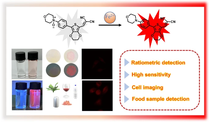 Han介绍了一种新型的基于π桥的荧光探针FeE,用于检测 Fe2+,该探针具有极高的灵敏度,荧光信号强度与 Fe2+ 浓度呈良好的线性关系,并能有效抗干扰。除了细胞外, 它还可以检测动物血液、菠菜、苹果汁、红酒、矿泉水和金属罐中是否含有 Fe2+。