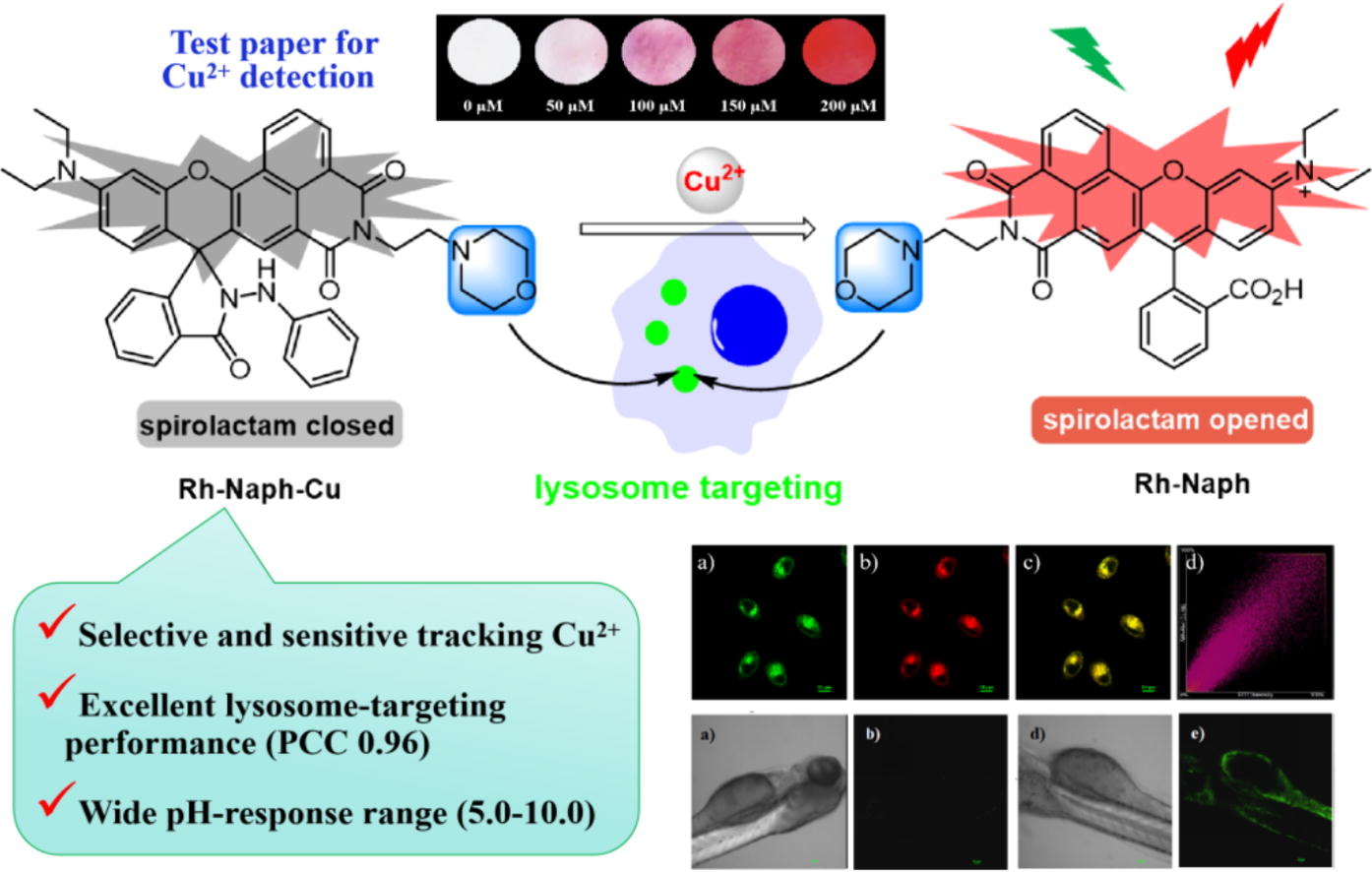 Shi等人报道了一种基于罗丹明的铜离子荧光探针,该探针同时具备溶酶体靶向能力,共定位系数高达 0.96,该探针可以制成的试纸,用于 Cu2+ 的原位显色检测,并能对活细胞和斑马鱼中的铜离子进行成像。