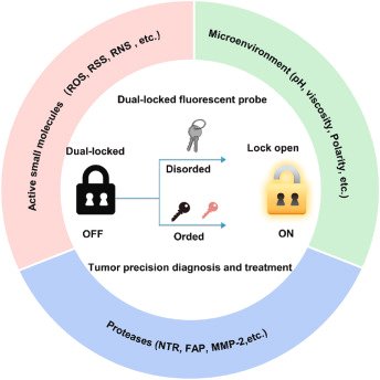 Xie等人综述讨论了双锁定探针的结构设计、反应机制和生物学应用,强调了它们在肿瘤成像和治疗方面的潜力。 重要的是,这篇综述探讨了这一领域的挑战和前景,全面审视了双锁定荧光探针在肿瘤学中的现状和未来潜力。
