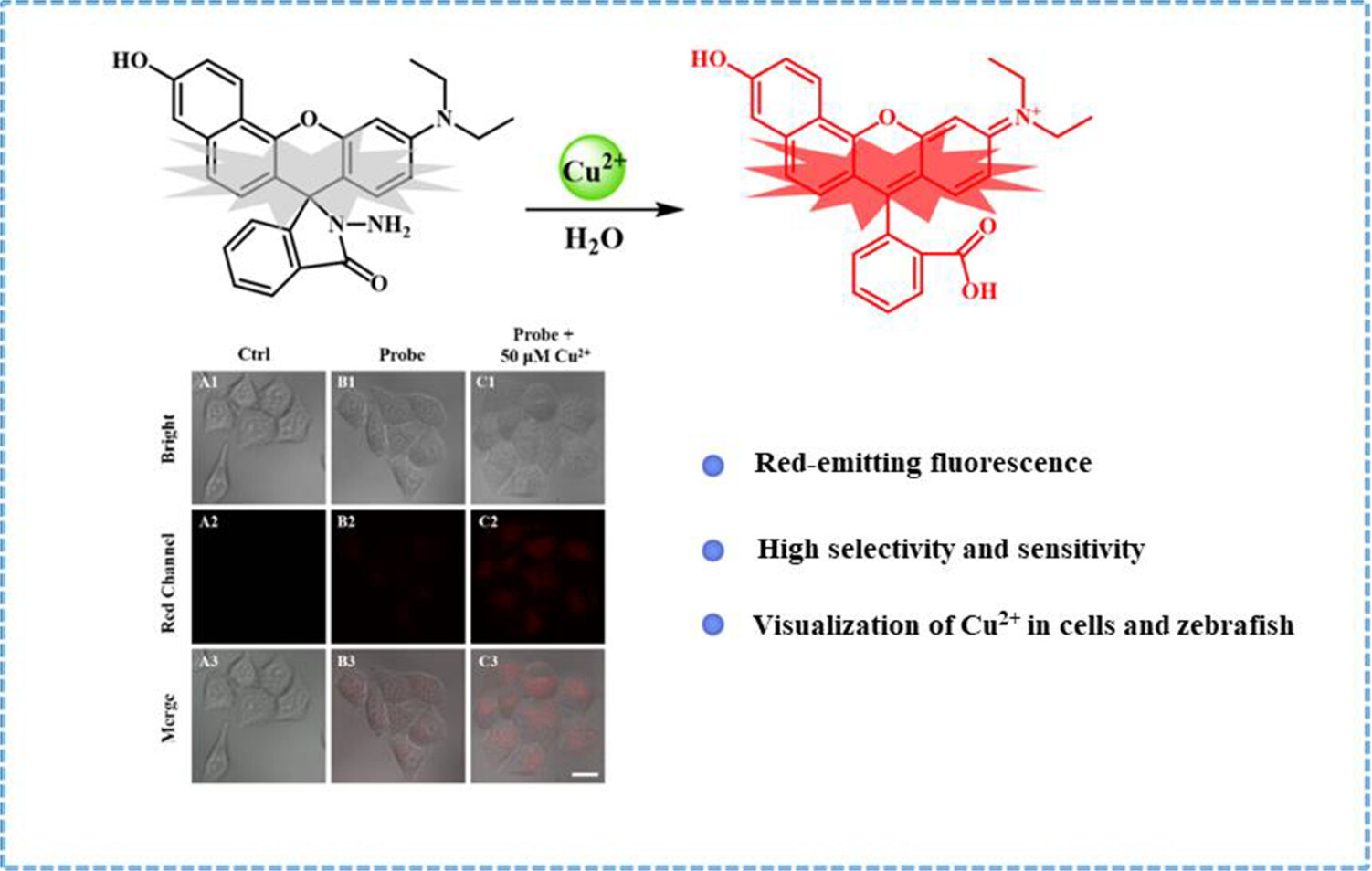 Chen等人设计并制备了一种新型的Cu2+荧光探针,该探针的荧光响应非常显著(增强了约 45 倍,同时具有响应速度快、选择性高、抗干扰性强等特点,而且由于其发射波长较长,因此检测限很低(22.9 nM)。