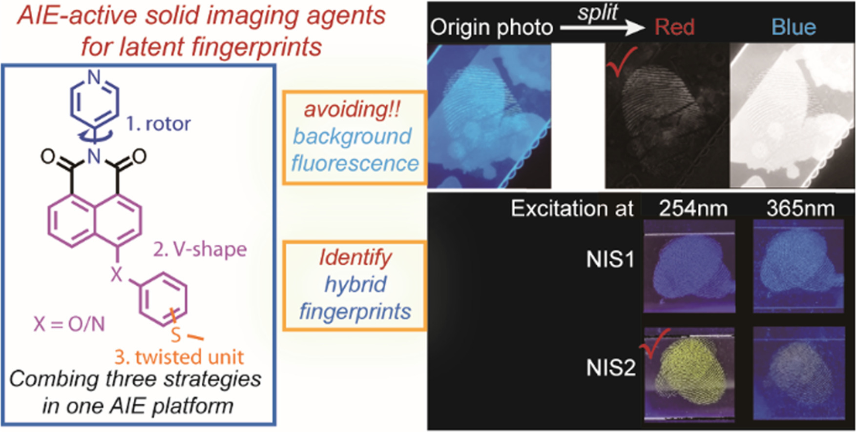 Liu等人设计并合成了两种萘酰亚胺衍生物(NIS1 和 NIS2),在不同极性的有机溶剂中,中心原子可调节这些分子在深蓝色(411∼436 nm,NIS1)和黄绿色(521∼540 nm,NIS2)区域的发射。 NIS1 和 NIS2 被成功应用于不同物质的潜在指纹成像。