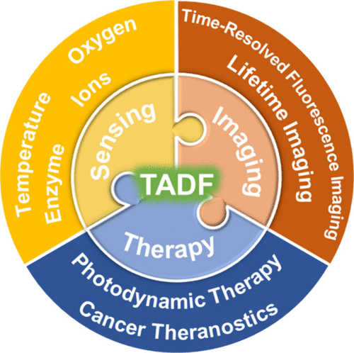 Tang等人综述介绍了延迟荧光分子的典型设计策略,并系统总结了近期发表的一些生物领域的 TADF 和聚集诱导 DF(AIDF)材料,涉及荧光生物传感、时间门控生物成像和光动力疗法。 此外,还讨论了生物领域中 DF 材料的未来前景,并提出了改进建议。