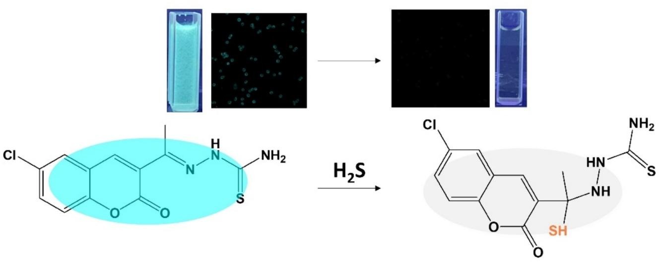 Wu等人制备了一种新型香豆素基荧光探针,加入 H2S 后,探针 1 的荧光显著增强,检测限低至 0.54 μM,同时颜色从青色变为无色,同样适用于HeLa 细胞中 H2S 的成像。