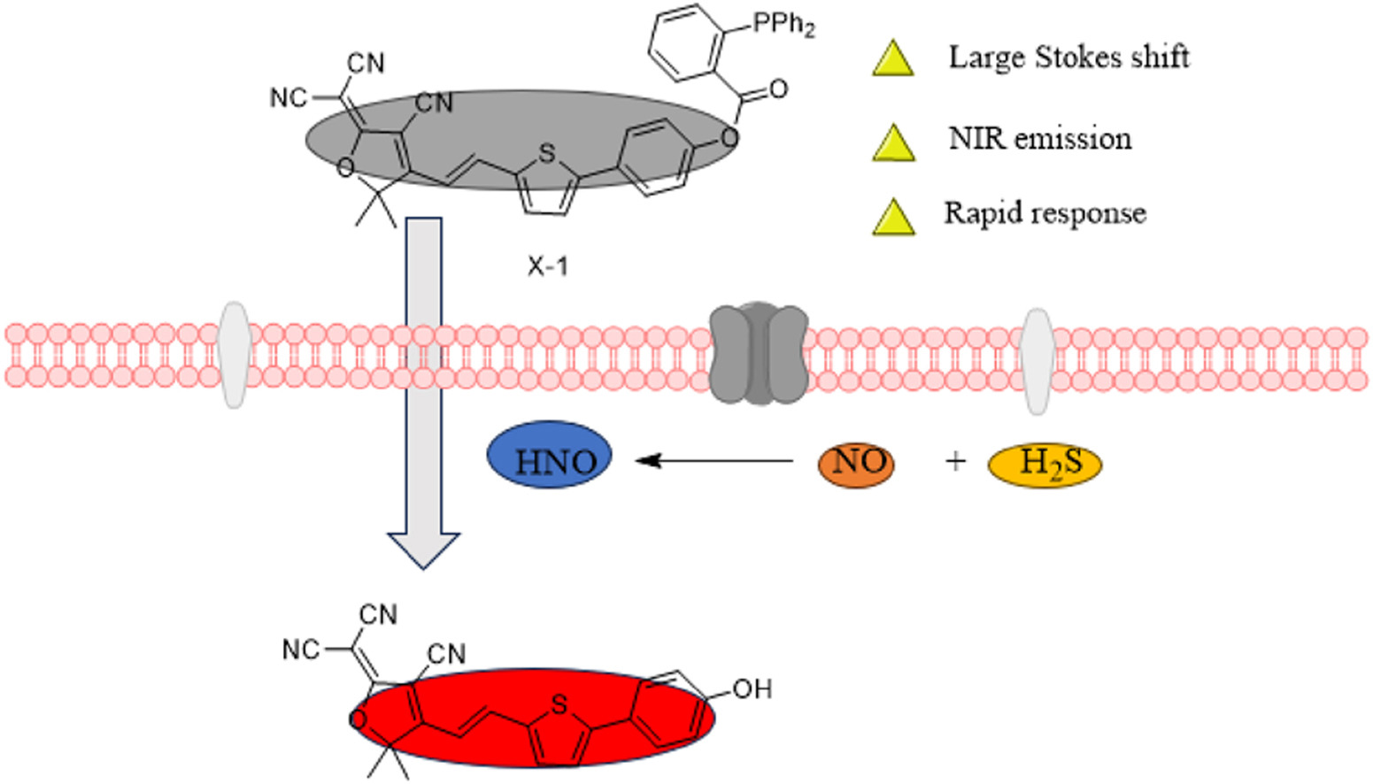 Ye等人合成了一种基于三氰基呋喃(TCF)衍生物的新型近红外 HNO 荧光探针 X-1。 X-1 在近红外区域(λem=660 nm)对 HNO 具有高选择性, 响应速度快(5 分钟)、检测限低、斯托克斯位移大(120 nm)、识别 HNO 的抗干扰能力强等优点。 适用于活体细胞中外源性和内源性 HNO 的成像。