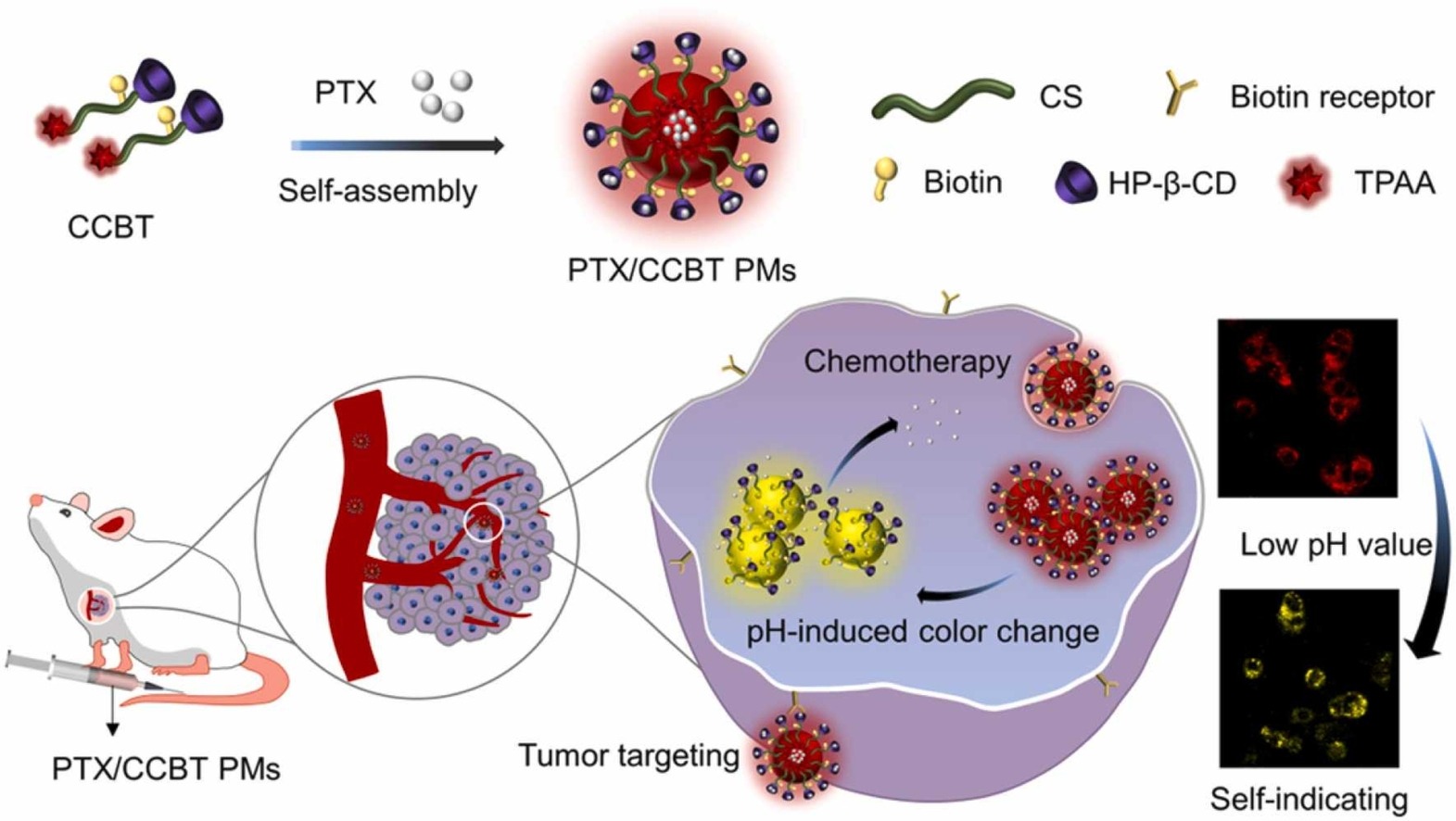 Sun等人合成了一种新型共聚物(CD-CS-Bio-TPAA,CCBT),它以生物素和羟丙基-β-环糊精共轭壳聚糖为亲水段,以四联苯乙烯衍生物(TPAA)为疏水段。 有趣的是,CCBT 表现出颜色可调的 AIE 行为,从红色过渡到黄色。 此外,CCBT 还能自组装成聚合物胶束,并用作药物载体,用于癌症的自我诊断治疗。