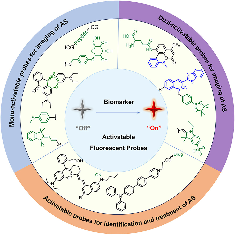 Chen等人以动脉粥样硬化微环境为研究对象,简要总结了单/双活化荧光探针在生物标记物刺激下的结构转变与荧光信号变化之间的相关性。此外,还介绍了他们在强直性脊柱炎治疗学方面取得的前沿进展。最后,探讨了基于动脉粥样硬化微环境的可激活治疗探针的前景,以促进影像引导的强直性脊柱炎精确治疗的创新研究。