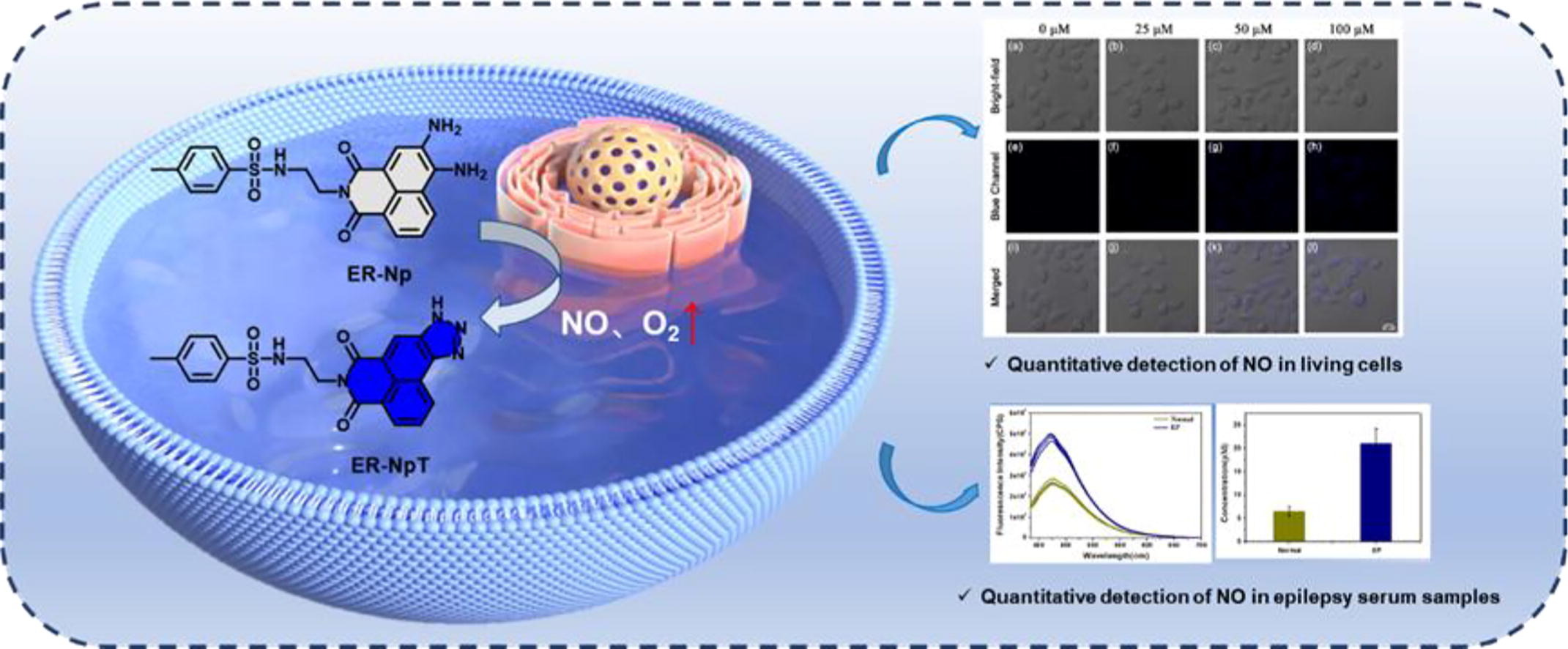 Wang等人构建了一种用于检测 NO 的 ER 靶向荧光探针(ER-Np)。 ER-Np具有高选择性、高灵敏度和ER靶向性,在二硫苏糖醇(DTT)诱导的活细胞ER应激过程中,作者成功地观察到了内源性NO的产生。 此外,作者还发现癫痫患儿血清中的 NO 含量会升高。
