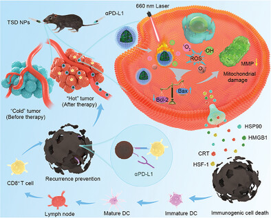 Tang等人报道了 "一体化 "光治疗纳米颗粒(TSD NPs),它具有平衡活性氧和光热转换能力,可用于联合光免疫疗法和ICB免疫疗法治疗OSCC。 该研究引入了一种新型电子受体——DTM,得益于 AIE 特性和 DTM 受体,TSD NPs 还具有很强的 I 型活性氧(ROS)生成能力和很高的光热转换效率(45.3%),能显著诱导免疫原性细胞死亡(ICD),激活细胞毒性 T 淋巴细胞,将免疫抑制性肿瘤微环境转化为免疫支持性环境。 此外,TSD NPs 还能上调 OSCC 细胞上 PD-L1 的表达,从而提高与 αPD-L1 ICB 免疫疗法联合治疗的疗效。