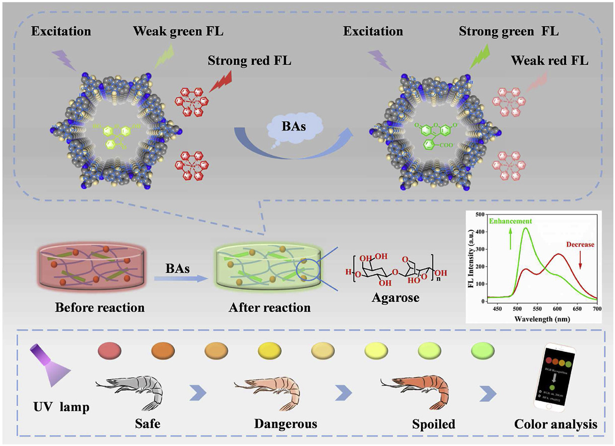 Hou等人构建了一种新型荧光传感器 Ru-Flu@COF ,对必需的生物胺 His 和 NH3-H2O 显示出双重反比荧光信号,从而实现了丰富的颜色梯度和腐败敏感的颜色鉴别。 His 和 NH3-H2O 的检测线性范围分别为 0.6∼200 μM 和 0.5∼60 mg/L,检测限分别为 0.5 μM 和 0.2 mg/L。 此外,Ru-Flu@COF 凝胶标签与智能手机配合使用,可实现对猪肉、鱼和虾的便携式原位肉眼新鲜度监测,通过凝胶标签颜色从红色(新鲜)到橙色(不太新鲜)、黄色(变质)和绿色(严重变质),可直观地识别新鲜度等级。
