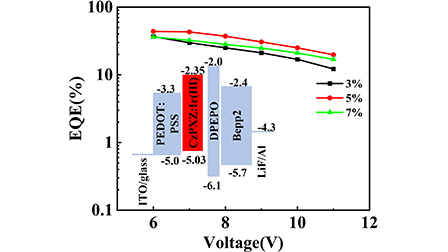 Yu等人开发了一种具有聚集诱导发光特性的热激活延迟荧光(TADF)材料 CzPXZ 和一种深红色磷光发射体 Ir(dmppy)(piq)2(od),并将他们组合成 CzPXZ-Ir(III),其电致发光发射峰位于 626 纳米波长处,外部量子效率高达 43.76%。
