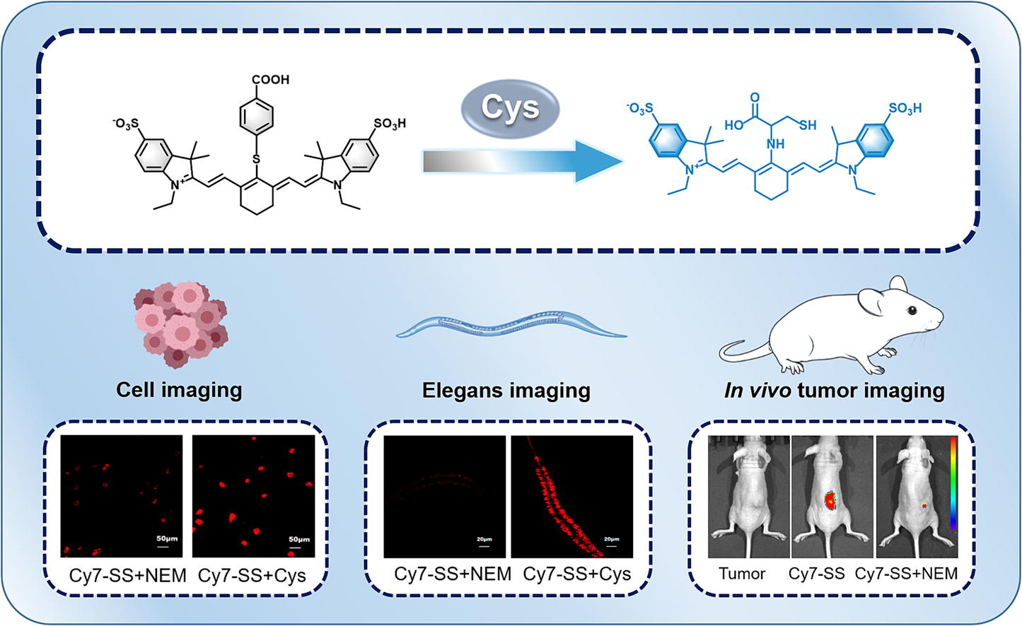 Zhao等人设计并合成了一种基于Cy7的高水溶性 Cys 探针(Cy7-SS),不仅对体外 Cys 的检测具有高选择性和高灵敏度,还可用于检测活细胞和秀丽隐杆线虫中的内源性 Cys,并且可用于临床诊断中的精确分析。