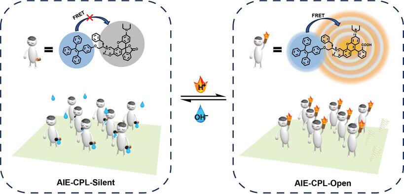 Wang等人通过结合聚集诱导发光(AIE)成分(TPE)、酸响应发光体(Rhodol)和手性苯胺,设计出了一种新型酸响应 CPL 可调分子。 得益于 TPE 的 "AIE "效应和 Rhodol 的酸敏感性,酸化分子(S-Rhodol-TPE)即使高浓度掺杂在聚合物基底中,也能表现出较高的 PLQY。 此外,由于 TPE 和 Rhodol 之间存在荧光共振能量转移(FRET)过程,S-Rhodol-TPE 的发射颜色可通过聚合物薄膜中 S-Rhodol-TPE 的掺杂比例和酸化程度轻松调节。