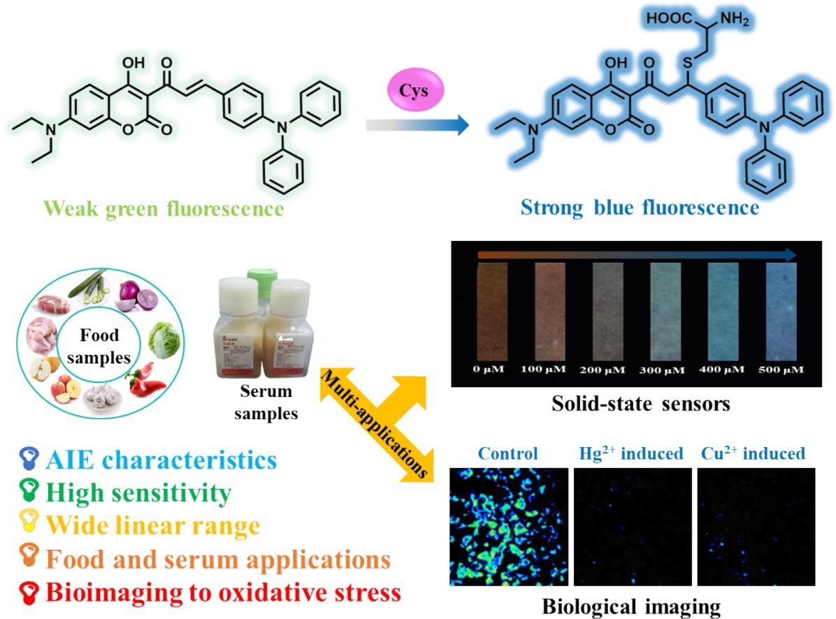 Ye等人报道了一种具有聚集诱导发光特性的半胱氨酸荧光探针NYVB,该探针由香豆素和三苯胺结构组成,具有良好的选择性、灵敏度、宽线性范围和低检测限等优点,并且可以用于检测真实食品样品和血清样品中的 Cys,此外,探针 NYVB 还成功用于检测 SKOV3 细胞中的内源性和外源性 Cys。