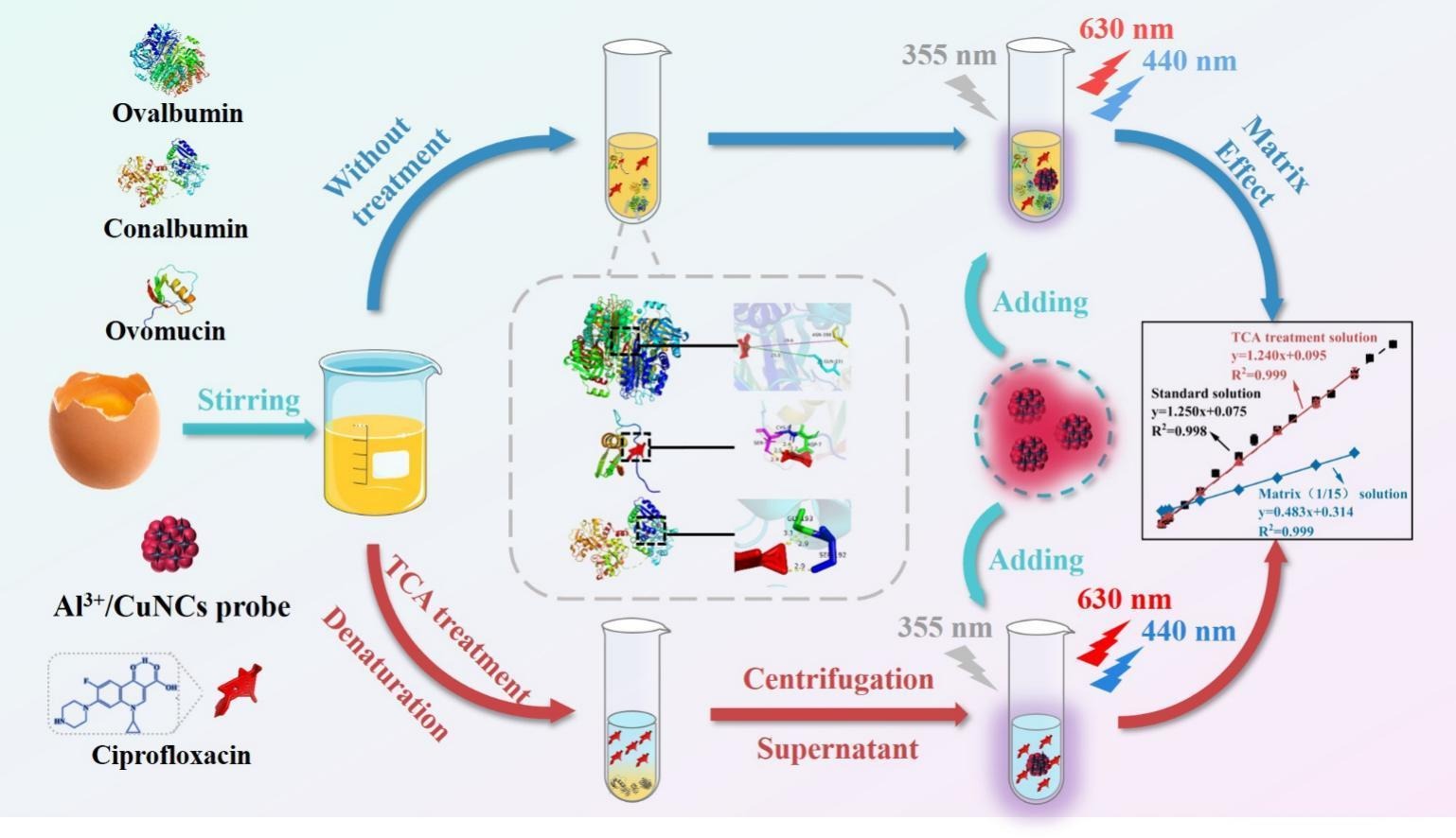Liu等人通过Al3+/CuNCs探针验证了荧光检测过程中的基质效应,发现在众多处理方法中,三氯醋酸处理能够有效降低蛋白质基质效应,利用这个发现,作者提高了鸡蛋中环丙沙星荧光检测的准确性。