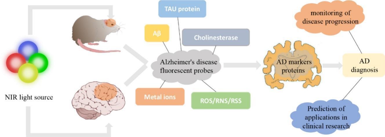 Wang等人总结了用于阿尔茨海默病成像的高选择性荧光探针,这些荧光探针主要针对 Aβ、TAU 蛋白、金属离子和活性氧/氮/硫物种等。