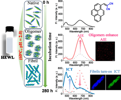 Mandai等人报导了一种基于芘的分子内电荷转移(ICT)染料Py-DCV,它具有较大的斯托克斯位移和聚集诱导发光(AIE)特性,可用于监测母鸡卵白溶菌酶(HEWL)蛋白质聚集过程中寡聚体和纤维的动态种群。