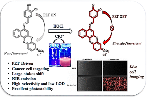Mahapatra等人报告了一种新型的近红外(NIR)荧光 "开启 "和高选择性的基于氯化苯并吩噁嗪的荧光探针 BPH,用于检测次氯酸盐。 BPH 的检测限为 2.39 × 10-10 M 或 0.23 nM,并可以用于 活体 MDA-MB 231 细胞中外源性和内源性次氯酸盐的检测。