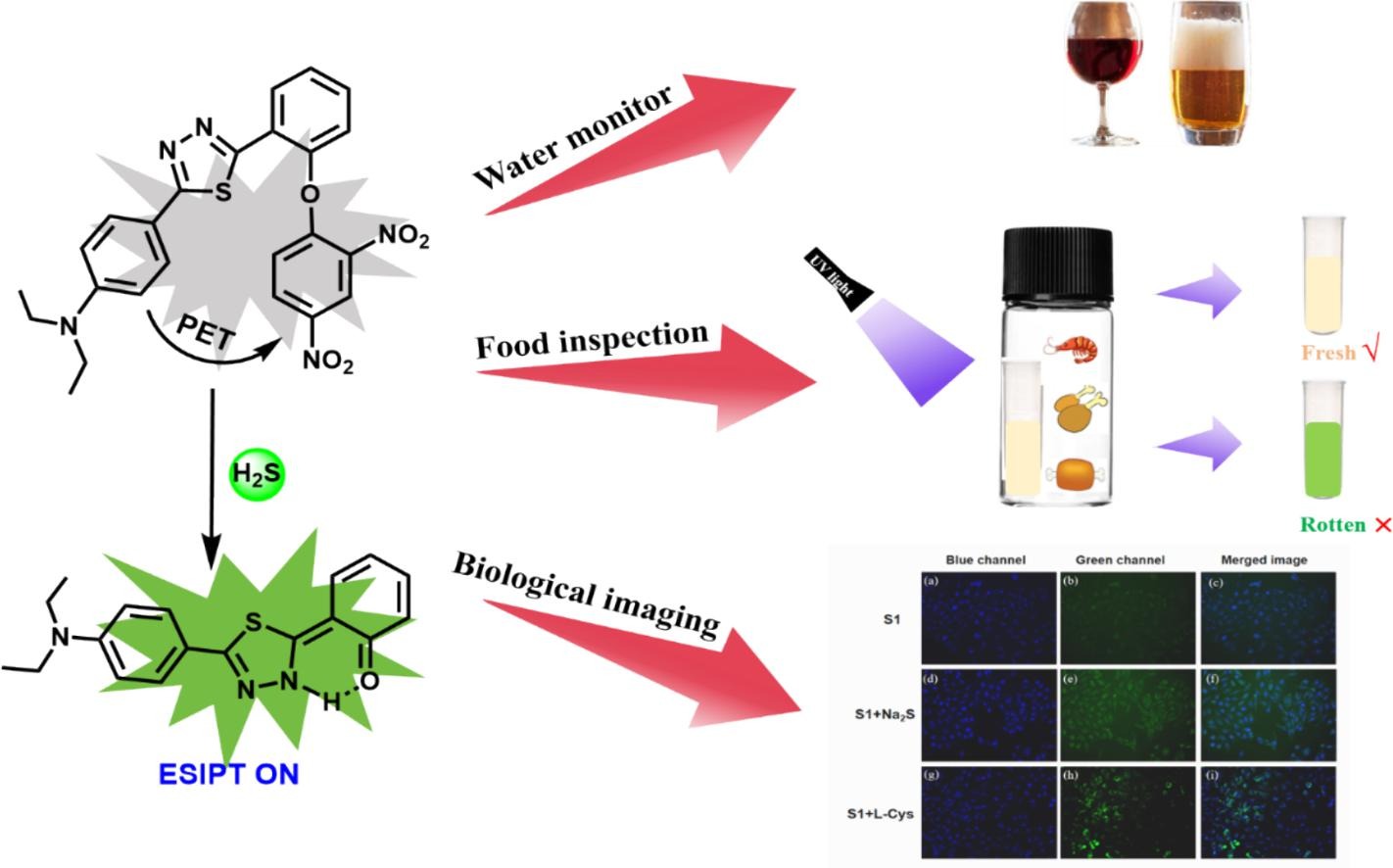 Jin等人基于 1,3,4-噻二唑,设计并合成了一种用于感知环境中H2S的荧光探针,在加入目标分析物后产生了一个 "关闭-开启 "过程。 对于H2S ,该探针表现出高灵敏度(LOD=60.8 nM)、大斯托克偏移(133 nm),并且在 pH 值为 6.0-9.0 的范围内性能稳定。 更重要的是,探针可用于检测真水、三种啤酒样品和红酒样品中的 H2S。 此外,探针还成功地用于观察 HeLa 细胞中的 H2S,并能通过 "肉眼 "和智能手机比色分析法实时监测食品腐败过程中的 H2S 。