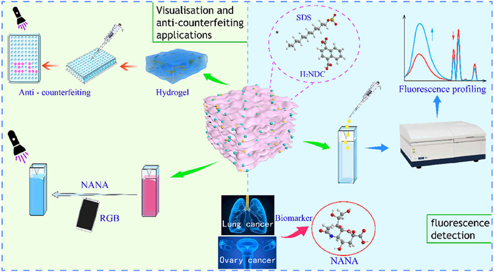 Jin等人基于层状稀土氢氧化物(LRH)的特性,合成了一种双发射荧光材料(NDC/SDS-LEuH),并进一步制备了一种用于检测 NANA 的荧光纳米探针(ANP)。 该探针具有高灵敏度(LOD=32.9 μM)、高选择性和快速响应等优点。 此外,作者还制备了一种探针水凝胶,可应用于防伪领域,提高防伪难度和防伪安全性。