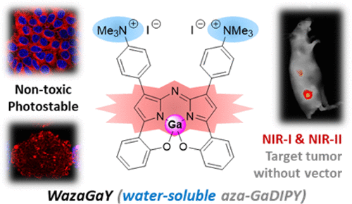 Sancey等人基于氮杂-BODIPYs开发了一种水溶性BODIPY衍生物WazaGaY,该衍生物可产生光色偏移并显著提高量子产率。 作者在不同的肿瘤细胞中观察了 WazaGaY-1 的细胞行为,确定了 WazaGaY-1 在体内的分布和安全性,并评估了不同类型肿瘤的摄取情况。