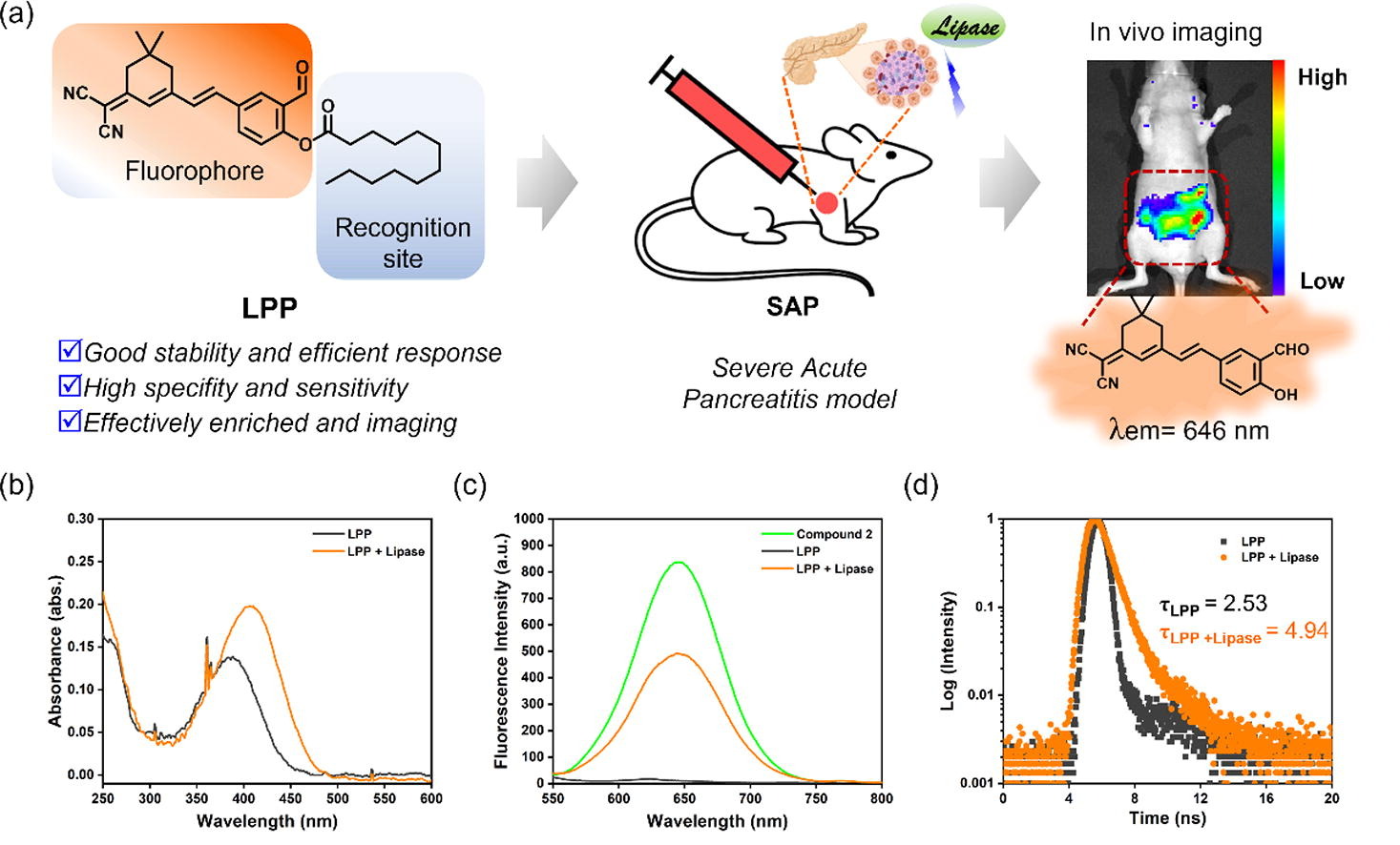 Li等人开发了一种新的荧光探针 LPP,用于监测 hPL 的活性,其检测限为 0.012 U/mL,反应在 10 分钟内完成,可有效监测各种生物样本中胰脂肪酶的活性。探针与脂肪酶反应后荧光寿命的变化可进行荧光寿命成像(FLIM),有效监测 hPL 的动态变化,实现对胰腺炎的早期诊断和监测。