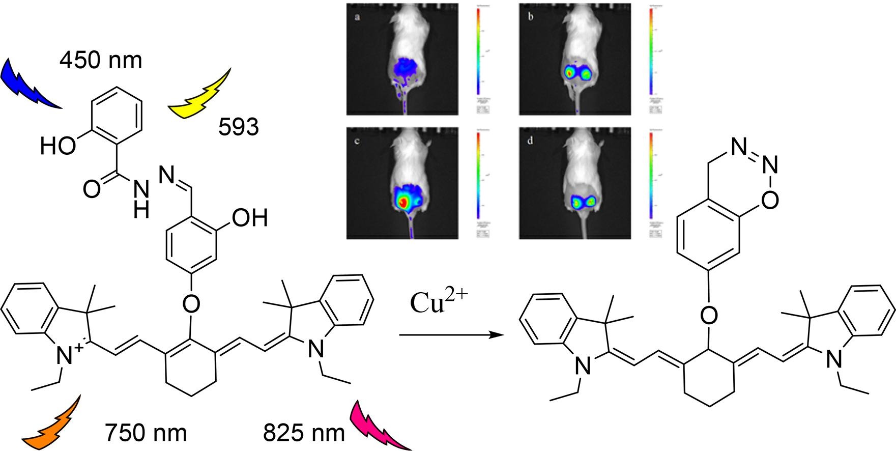 He等人基于Cy7开发了一种新的 Cu2+ 近红外荧光探针 NUST-Cy-1,它在结合 Cu2+ 之后其450 nm和750 nm的荧光发射会发生变化,其在水溶液中检测 Cu2+ 的检测限制为1.4 μM,并能在体外和体内对 Cu2+ 进行有效的生物成像。