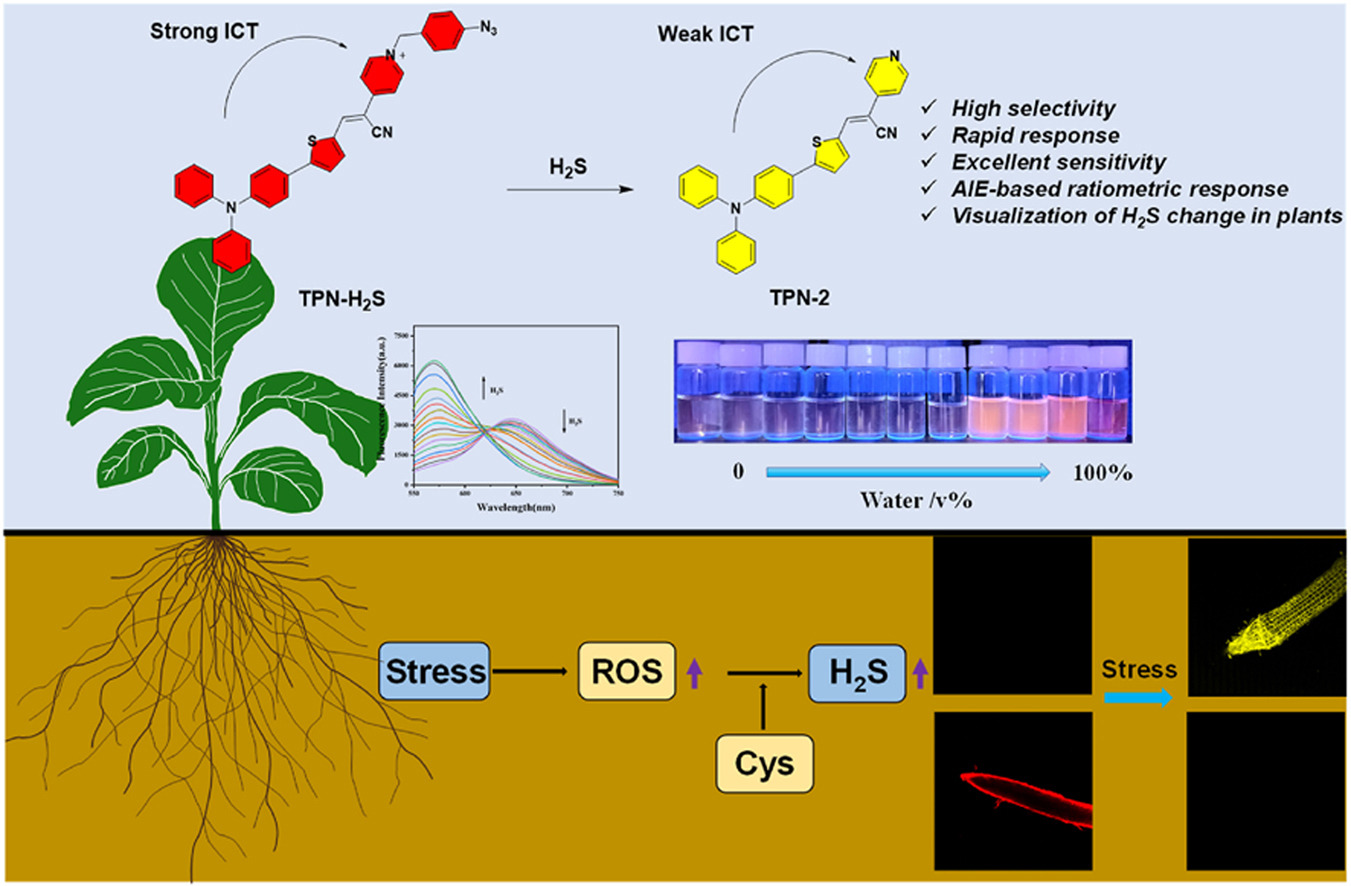 Ji等人报告了一种基于聚集诱导发光(AIE)的比率型荧光探针 TPN-H2S,用于高选择性地检测植物组织中的 H2S。 与其他分析物相比,该探针对 H2S 具有极高的灵敏度和选择性,可实时监测活细胞中 H2S 的动态。 作者利用高通量筛选方法,确定了氯化钙(CaCl2)和脱落酸(ABA)等外源物质,这些物质可在植物胁迫响应期间诱导更高水平的 H2S 生成。