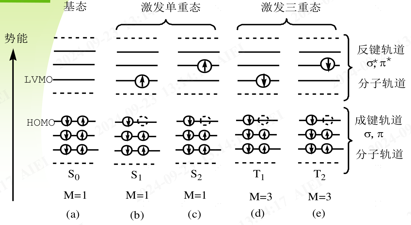 图中一共分为了5种情况,第一,所有的电子都处于激发态,也就是所有电子都处于成键轨道上,这是电子两两成对,方向相反,因此每个轨道的上的电子自旋量子数代数和S都等于0 (,所以整个体系的多重度为M=2S+1=1,也就是单重态,但是处于基态的电子一般不讨论是单重态还是三重态,而对于不同的激发情况b和c而言,电子自旋没有发生改变,因此其自旋量子数也没有变化,结果就是整个体系的多重度依然为1,因此也是激发单重态。 但是对于情况d和e,电子在激发的过程种发生了自旋量子数的改变,也就是从变成了或者从变成了,不管是哪一种情况,电子的自旋量子数代数和都从0变成了1, 因此整个体系的多重度也就变成了M=2S+1=3,也就是激发三重态,这里的三就是来源于多重度。