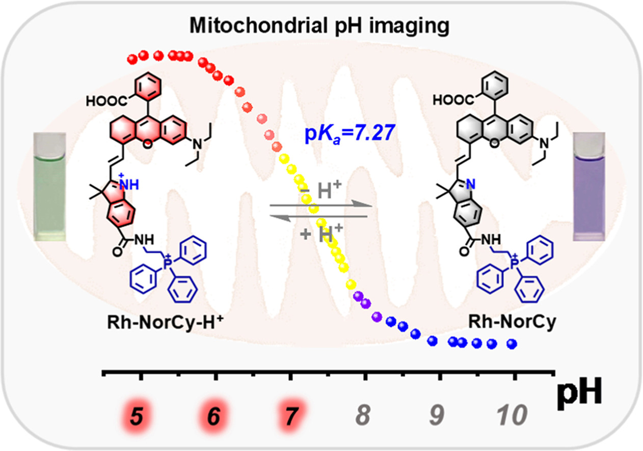 Yang等人报道了一种基于罗丹明的线粒体靶向近红外 pH 敏感荧光探针 Rh-NorCy,当溶液 pH 值从 9.1 降到 5.8 时,Rh-NorCy 结构中的吲哚鎓 N 原子发生质子化,导致其最大吸收波长从 568 纳米红移到 709 纳米,同时在 748 纳米处的荧光显著增强。 重要的是,Rh-NorCy 的 pKa 值(7.27)适合绘制线粒体中的 pH 值变化图。 Rh-NorCy 具有出色的线粒体靶向能力。 能够观察饥饿和间氯苯肼羰基化物(CCCP)诱导的线粒体有丝分裂过程中线粒体 pH 值的波动。