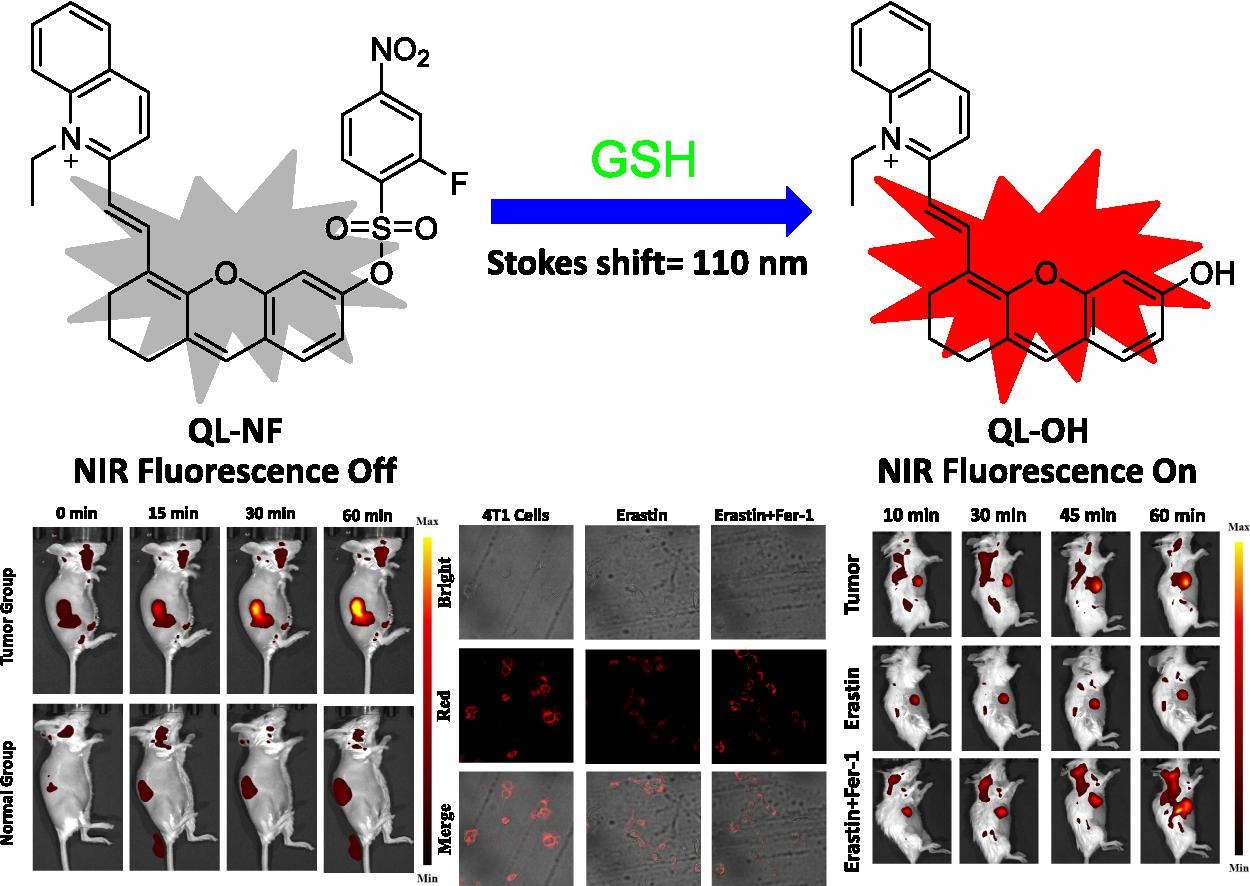 Zhang等人报道了一种用于GSH检测的荧光探针QL-NF,该探针具有110 nm的斯托克斯位移,发射波长位于近红外区域,并且线性响应范围为 0.50 mM-10.00 mM。
