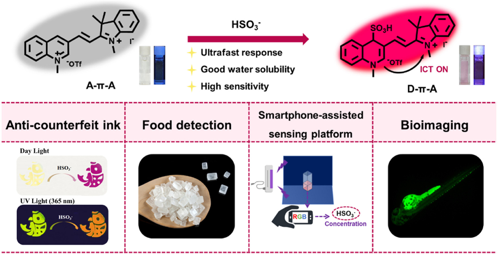 Zhong等人制备了一种基于分子内电荷转移(ICT)机制的水溶性荧光探针 ID-QL,它对 HSO3-具有比色和荧光双通道响应,具有超快、高选择性和高灵敏度的检测能力。ID-QL 尤其可用于定量检测真实食品样品中的HSO3-。