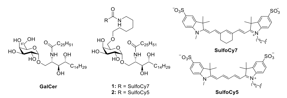 Clausen等人合成了 sulfoCy7-αGalCer 1 和 sulfoCy5-αGalCer 2,这些荧光探针由αGalCer和sulfoCy7/sulfoCy5 组成。 作者使用荧光成像和流式细胞仪对其在小鼠树突状细胞系中的细胞呈现进行了研究。 成像结果表明,装载了 sulfoCy5-αGalCer 的脂质体能以异质性和浓度依赖性的方式被 DC2.4 细胞吸收。