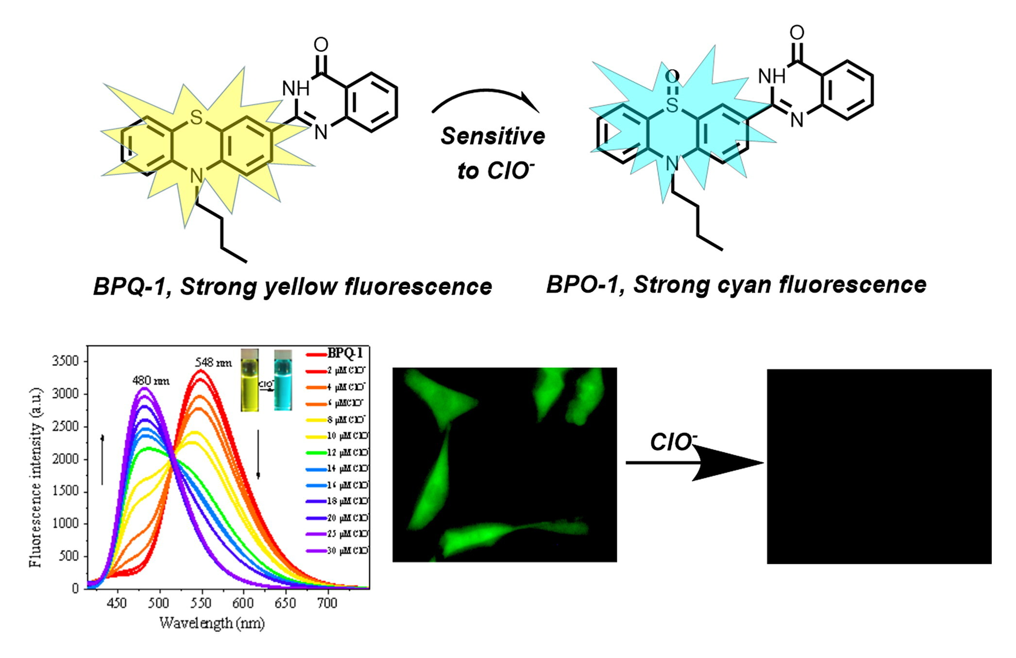 Nie等人合成了一种具有大共轭体系(吩噻嗪与喹唑啉酮共轭)的新型荧光探针(BPQ-1)。BPQ-1 在 10 秒内对 ClO- 显示出显著的比率荧光响应,并实现了较大的 Stokes 偏移(168 nm)、高灵敏度(LOD = 16.7 nM)和优异的选择性,并可以用于活细胞中外源 ClO- 的荧光成像。