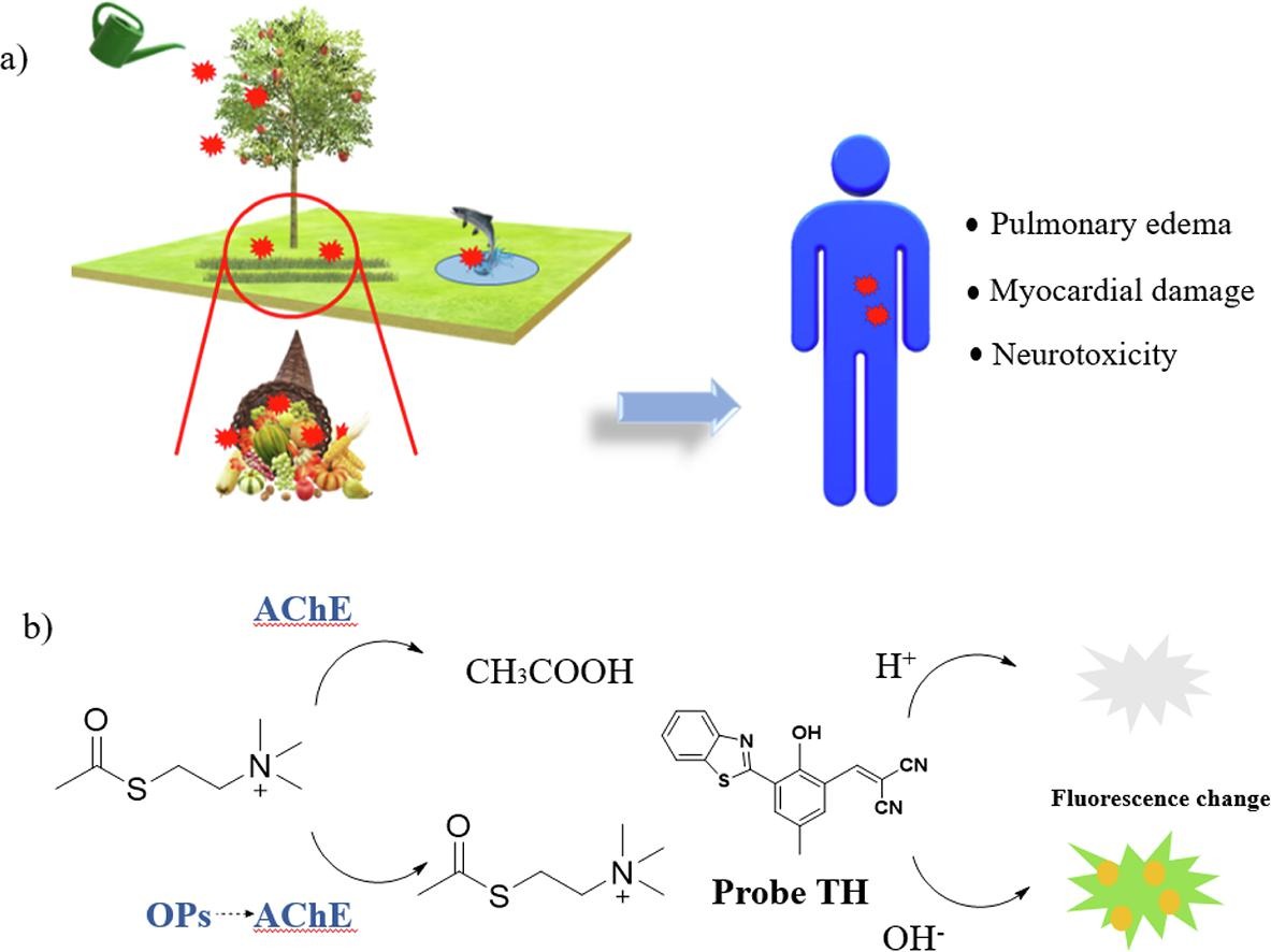 Ye等人合成了一种基于 ESIPT 机制的新型荧光探针 TH-1,该探针在不同 pH 溶液中显示出特异的荧光效应。重要的是,AChE 催化了碘化乙酰硫代胆碱(ATCH)的水解产物,并改变了溶液的 pH 值,从而影响了其荧光强度。此外,探针 TH-1 还被用于检测活细胞和线虫体内的 pH 值,为揭示 OPs 在生理和病理过程中的潜在机制提供了一种高效的化学传感器。